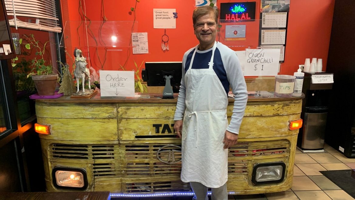 Joel Rose Jagdeep Nayyar, owner and chef at My Taste of India, stands in front of the register stand that’s made from the front panel of a real Tata truck — the best-selling brand in India. Joel Rose/Joel Rose hide caption Jagdeep Nayyar, owner and chef at My Taste of India, stands in front of